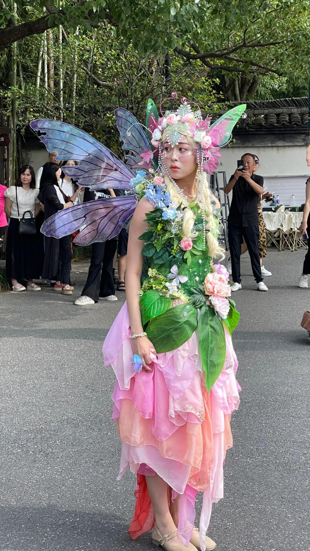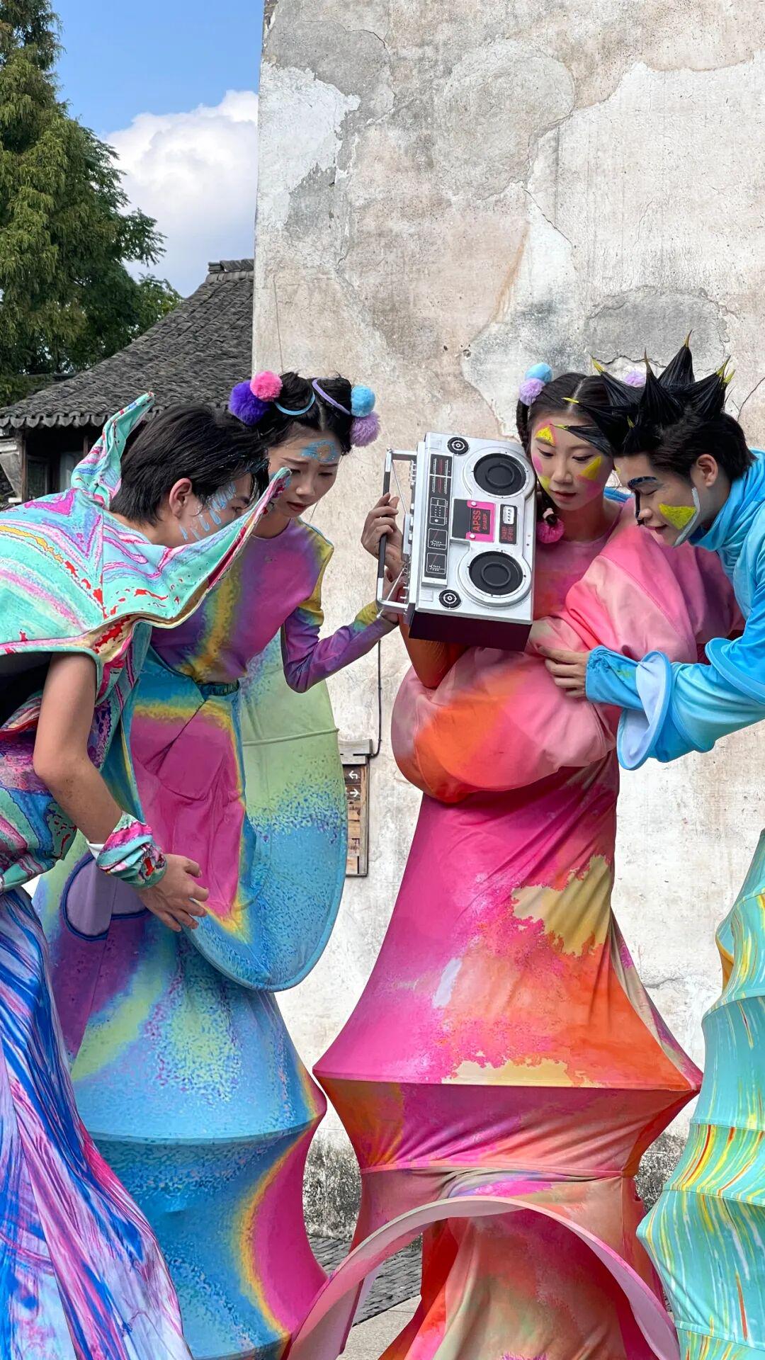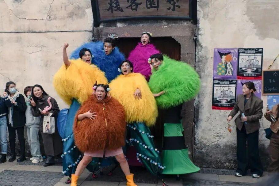 跟“蛹剧团”的创始人彭露聊天之后了解到,她是一名生活在厦门的戏剧人,也是一名大学表演老师。2018年,她和学生们一同创立了一个小型戏剧工作室,2022年,“蛹剧团”正式以公司化的形式运作,尝试了更多实验戏剧和公共空间的演绎。尝试高跷马戏的灵感,来源于2024年一次戏剧节中彭露与一位来自澳门的高跷马戏导演的相遇。这位导演曾在太阳马戏团受训,对高跷马戏表演驾轻就熟。这种在国内很少人掌握的技术吸引了彭露,他们从法国购买了专业的高跷,从零到一投入训练。几个月后,“蛹剧团”第一次登上乌镇戏剧节嘉年华的舞台,一举出圈,让更多人看到了这支来自厦门的年轻团队。今年,他们再次带着新的作品回到乌镇的街巷中。