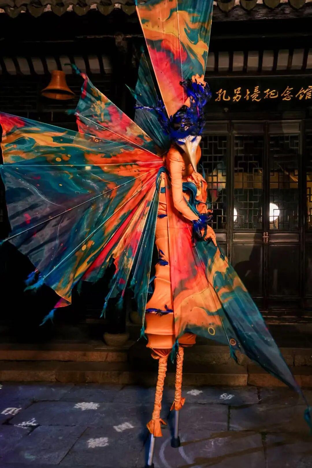 来自法国“明天改变一切剧团”的作品《鸟人与他的奇美拉乐队》,为乌镇的青石板路注入了灵动的法式浪漫。“鸟人”以极具辨识度的造型成为视觉焦点,庞大的身躯裹着蓬松羽毛,眨巴的眼睛流露孩童般的稚气,时而挥舞翅膀掠过人群,时而用羽毛轻扫路人肩头,狡黠又温柔的互动瞬间拉近距离。伴随灵动旋律,乐队奏响明快节奏,鼓点与音符交织,让白莲塔下的街巷化作流动舞池,羽毛飘落时的轻盈与乐声共振,仿佛将人拽入宫崎骏式的童话世界。这支来自法国的剧团“明天改变一切”(Cie Demain on change tout),擅长以怪诞童趣的街头艺术打破空间界限,除《鸟人与他的奇美拉乐队》外,剧团还带来了另一个作品《吆喝火人》,以强互动性和沉浸式氛围,成为本届嘉年华中极具感染力的海外力量。