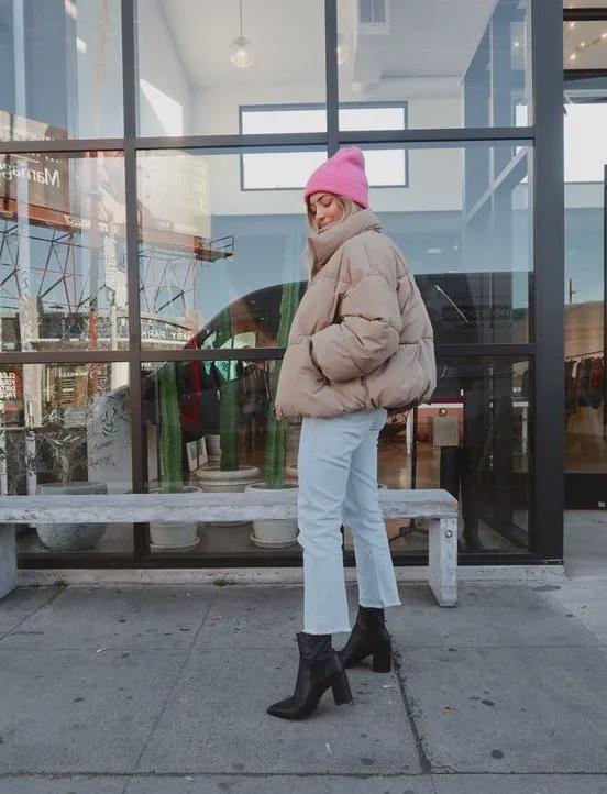 咖色短款羽绒服+黑色高跟靴子:高级品位尽显咖色短款羽绒服视觉上塑造流畅线条,轻松打造黄金比例,搭浅色系牛仔裤,也能穿出优雅高级的风格。踩双黑色高跟靴子,营造休闲又随性的感觉。