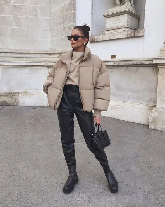 黑色收腰羽绒服+黑色马丁靴:显高又纤细黑色收腰羽绒服太懂女生了!收腰设计能勾勒腰线,赋予冬天独特的魅力与温度,再踩双黑色马丁靴,视觉上拉长腿部线条,打造修长身姿,155穿也像165,日常出门这么穿,显高又显瘦,还能轻松hold住各种场合。